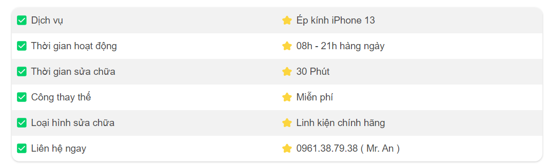 Kính iPhone 13 sẽ được thay mới trong vòng 2 – 3 giờ với giá cả phải chăng. Bạn hãy liên hệ đặt trước dịch vụ thay kính iPhone chính hãng tại Tân Lập Mobile bằng cách gọi tổng đài 0961.38.79.38 ( Mr. An ) của Tân Lập Mobile nhé!
