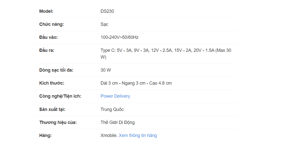• Với công suất tối đa có thể hỗ trợ lên đến 30 W, giúp sạc nhanh chóng và an toàn. Adapter Sạc Type C PD GaN 30W Xmobile DS230 này hoàn toàn đáp ứng sạc pin được cho điện thoại, máy tính bảng, tai nghe,… của bạn.