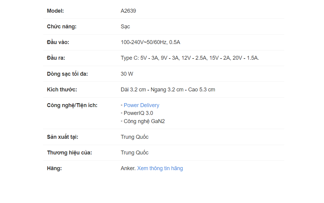 Adapter Sạc Type C PD PIQ GaN II 30W Anker 313 A2639