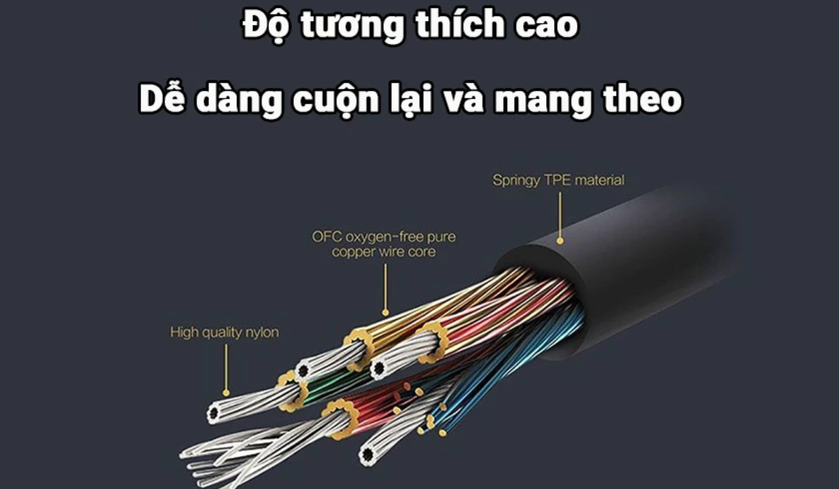 Phần lõi cáp được làm từ lõi đồng nguyên chất kỵ khí OFC giúp dẫn điện và truyền âm tốt. Cáp có chiều dài lên đến 1m, nhờ chiều dài này, mà cáp dễ dàng kết nối giữa các thiết bị mà không mang lại nhiều khó khăn.