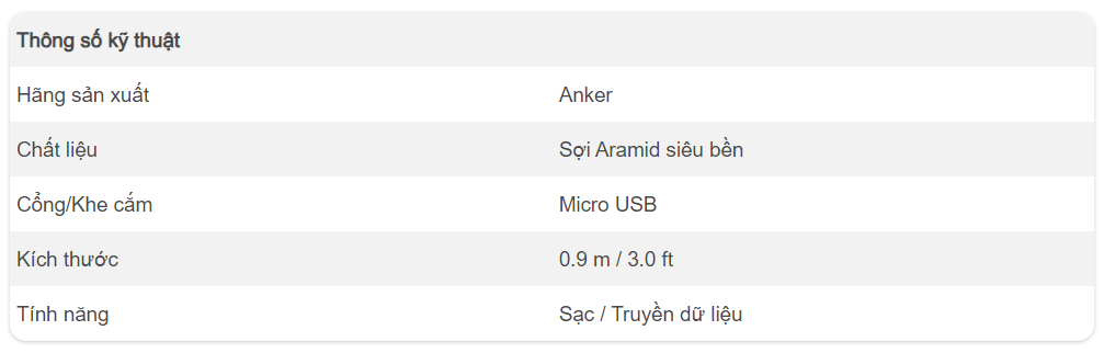 Cáp Anker PowerLine Micro USB A8132 có thiết kế đơn giản với chất liệu Aramid chắc chắn, nhằm giúp cho bạn yên tâm khi cuộn gọn cáp lại và mang theo bên mình không lo bị gập, gãy cáp.