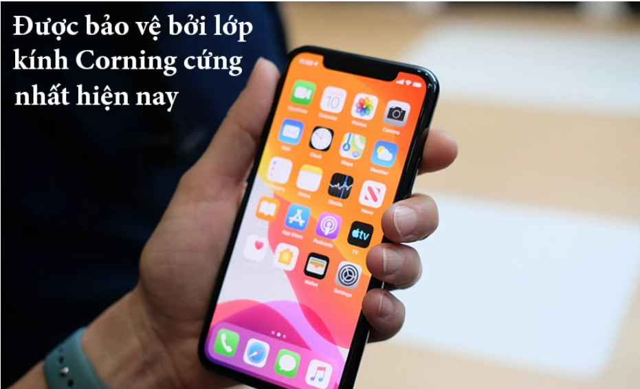Màn hình của iPhone 11 Pro Max được bảo vệ bởi “lớp kính cứng nhất hành tinh”. Đó là biệt danh của lớp kính được sản xuất bởi Corning. Và đây là lớp kính bảo vệ là một phiên bản nâng cấp từ lớp kính trên iPhone XS. Kể từ khi chiếc iPhone đầu tiên được ra mắt, Apple đã sử dụng lớp kính bảo vệ Gorilla Glass phiên bản tùy chỉnh cho sản phẩm của mình và năm ngoái, Apple đã sử dụng một phiên bản tùy chỉnh của Gorilla Glass 6 để bảo vệ chiếc iPhone XS.