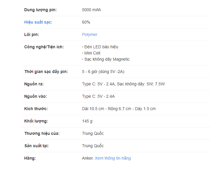 • Pin sạc dự phòng Polymer 5000mAh Không dây Magnetic Type C 12W Anker MagGo A1611 Dung lượng pin lên đến 5.000 mAh, hiệu suất sạc 60%. Mức sạc cụ thể dành cho một vài mẫu iPhone như sau: