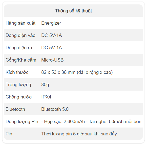 Tai nghe được trang bị viên pin dung lượng lớn, với dung lượng 50mAh mỗi tai cùng hộp sạc lên đến 2600mAh, cho thời gian sử dụng lên đến 5 giờ. Energizer UB2609 còn hỗ trợ chuẩn chống nước IPX-4, nhờ đó người dùng có thể sử dụng cả trong quá trình tập luyện mà không lo ảnh hưởng đến tai nghe.