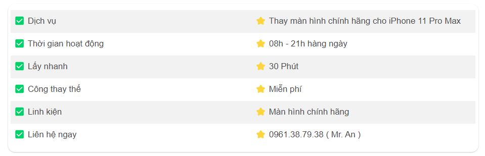 Bạn đang sở hữu một chiếc iPhone 11 Pro Max vẫn còn hoạt động tốt nhưng màn hình bị chảy mực, bị sọc, nhiễu? Chi phí Thay màn hình chính hãng cho iPhone 11 Pro Max chính hãng Apple quá cao khiến bạn lăn tăn trong việc chi tiền sửa chữa? Lựa chọn Thay màn hình chính hãng cho iPhone 11 Pro Max là lựa chọn tối ưu dành cho bạn.