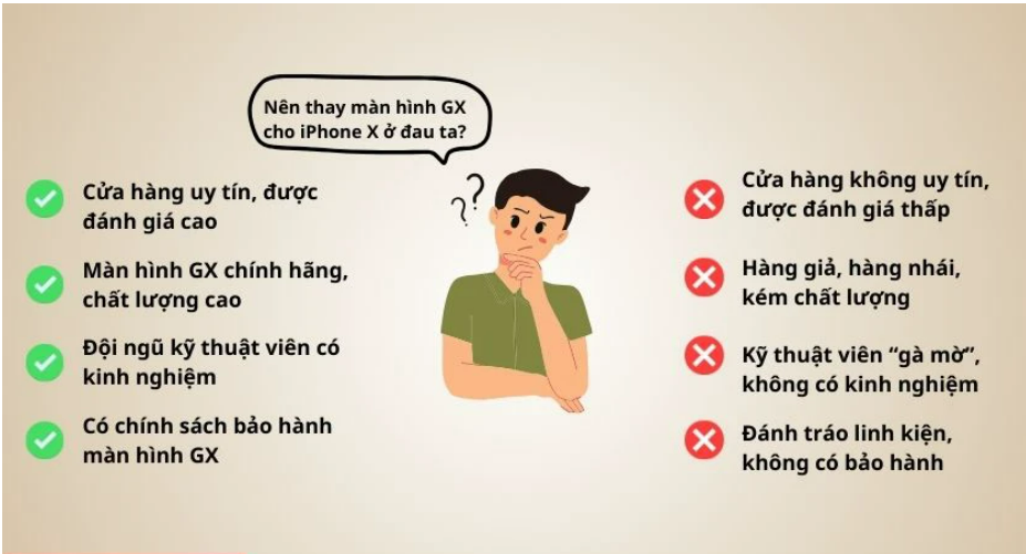 Nếu thay màn hình GX tại những nơi không uy tín thì sẽ ảnh hưởng nhiều đến iPhone X của bạn. Cụ thể, không phải tất cả các cửa hàng sửa chữa điện thoại đều có màn hình GX chính hãng. Sản phẩm này phải được sự ủy quyền của chính nhà sản xuất thì mới được bán ngoài thị trường. Vì vậy nên vấn đề về hàng giả, hàng nhái có trên thị trường rất nhiều với giá cực kì rẻ.