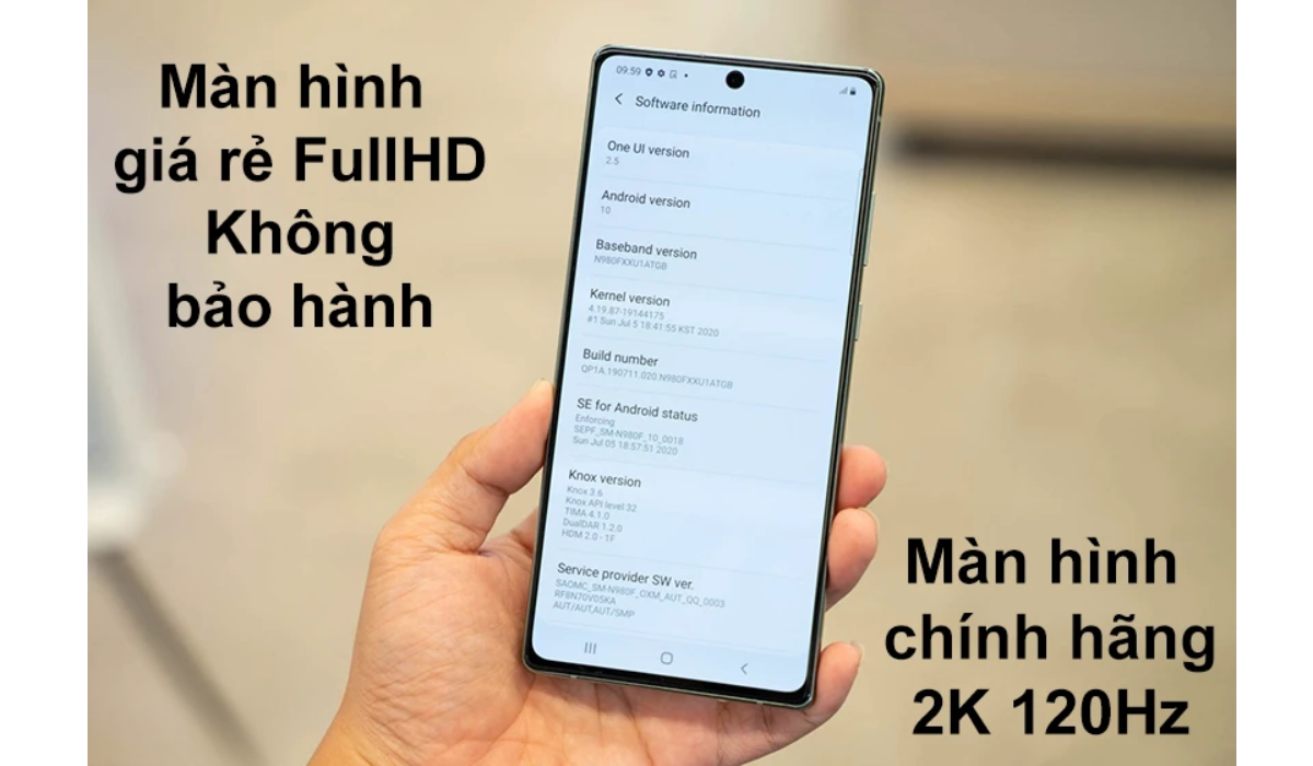 - Màn hình Note 20 Ultra giá rẻ: Đây là loại có kích thước tương tự như màn hình chuẩn. Nhưng thiết kế mặt kính là loại tầm trung không có cường lực như zin. Chất lượng hình ảnh chỉ đạt FullHD và tần số quét chỉ 60Hz. Ưu điểm của loại này là được bán tràn lan trên thị trường với giá rẻ chỉ bằng 1/3 hàng chính hãng và thường không được bảo hành.