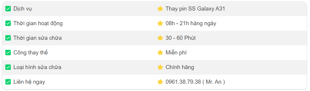 Khi thay pin Samsung Galaxy A31 tại Tân Lập Mobile, bạn sẽ được hưởng nhiều ưu đãi hấp dẫn: