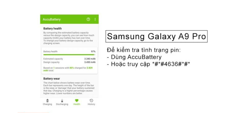 Galaxy A9 Pro là một thiết bị cho thời gian chơi game, giải trí dai dẳng. Nhưng sau một thời gian dài sử dụng, thời lượng pin thực tế sẽ giảm đi dần, tuổi thọ pin đi xuống. Số lần sạc pin Samsung Galaxy cũng xảy ra thường xuyên hơn trước. Và thậm chí đôi khi đang sử dụng, máy sẽ xảy ra tình trạng tắt nguồn đột ngột. Đây đều là những dấu hiệu thông báo ‘căn bệnh’ chai pin. Để “đánh bay” tình trạng trên cho thiết bị, cách duy nhất lúc này là thay một viên pin SS A9 Pro mới. Những dấu hiệu chai pin, người dùng cũng có thể tải phần mềm Battery Life về để có thể kiểm tra mức độ chai pin. Hoặc từ màn hình gọi điện của thiết bị, bạn có thể bấm đoạn mã *#*#4636#*#*, sau đó vào phần Battery Information kiểm tra tình trạng sức khỏe pin, mức pin thực tế còn lại.