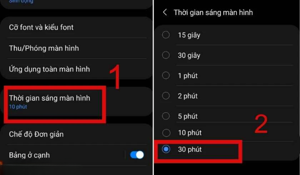 Bước 2: Ở mục màn hình bạn chọn Thời gian sáng màn hình. Sau đó chọn 30 phút.