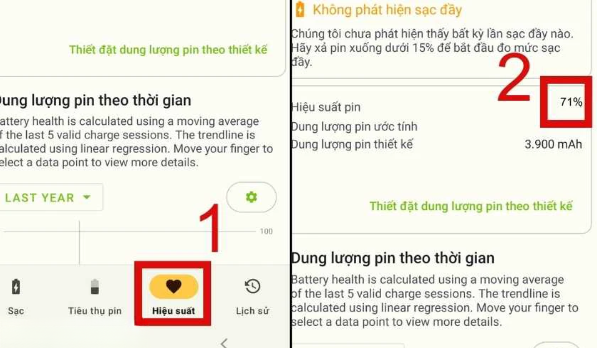 Bước 2: Tiếp theo bạn nhấn chọn mục Hiệu suất trong giao diện. Tượng tự, nếu pin bạn đạt trên 80% thì pin Samsung đang tốt, còn dưới 80% thì pin bạn đã bị chai và cần thay mới.