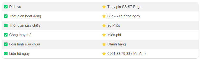 Giá pin Samsung Galaxy S7 Edge đã có công thợ, không thêm chi phí nào khác. Để tham khảo thêm về bảng giá dịch vụ, quý khách vui lòng liên hệ ngay