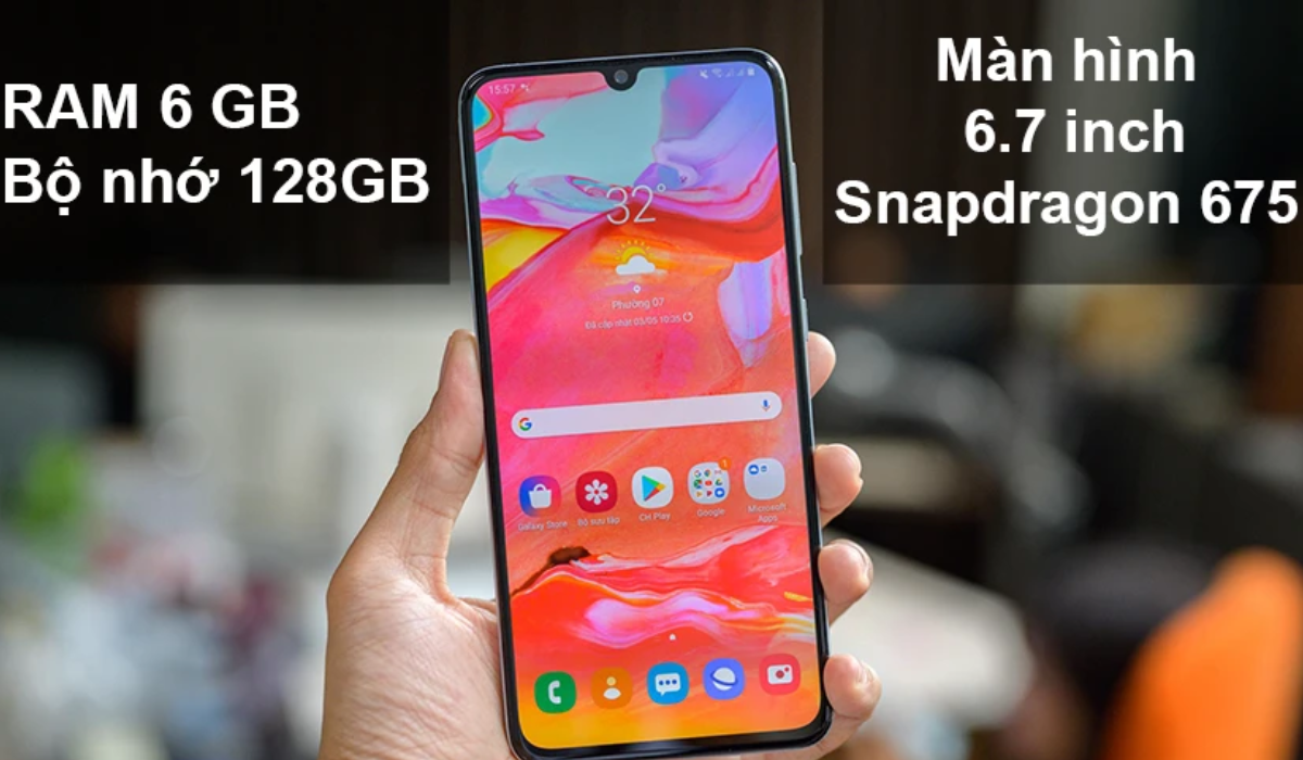 Máy được trang bị vi xử lý Snapdragon 675 mạnh mẽ, đi kèm dung lượng RAM 6 GB, bộ nhớ trong 128 GB, dung lượng pin lên tới 4500mAh. Với cấu hình mạnh thì vẻ ngoài của Samsung Galaxy A70 cũng được Samsung chú ý đáng kể.